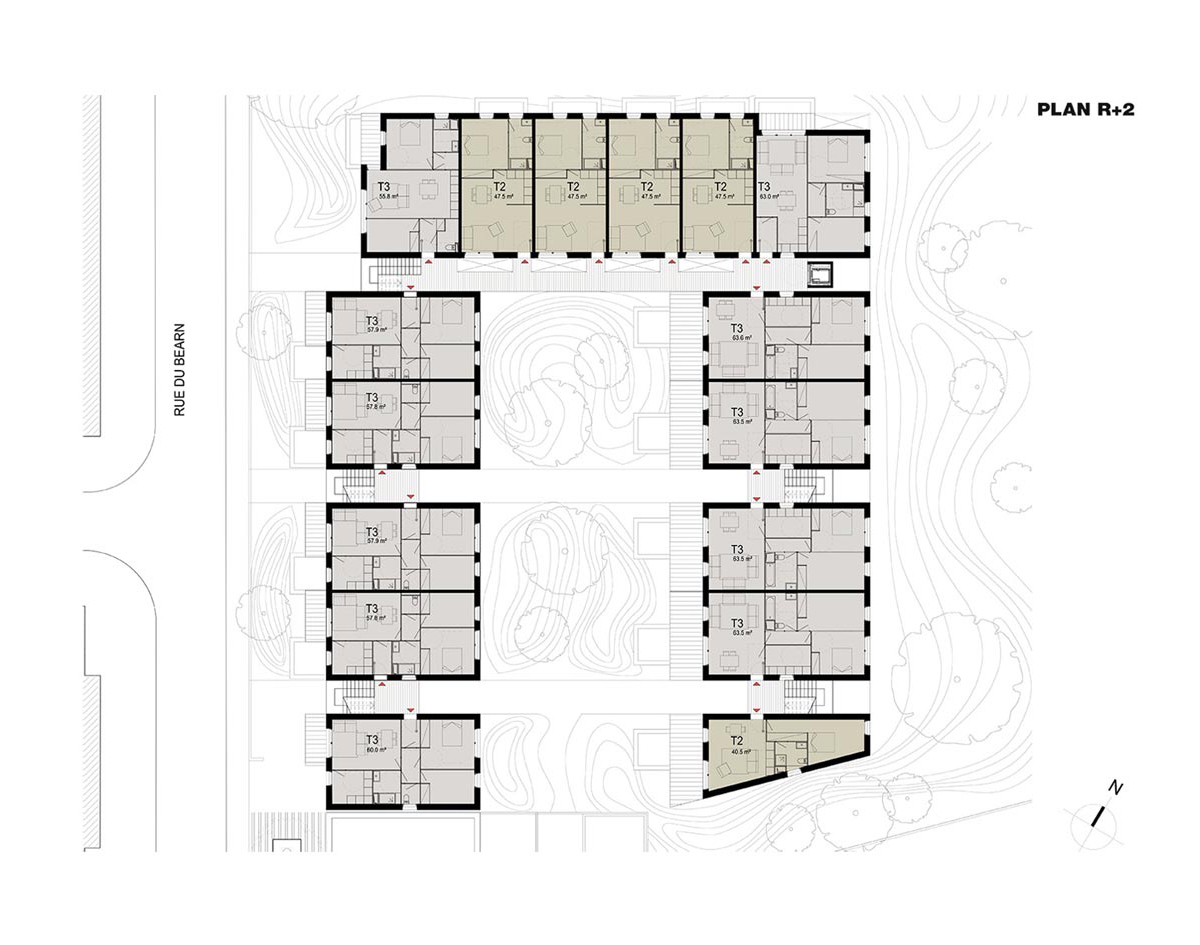 We propose a typology that combines the social demand for individual housing with the central location of the plot, calling for a certain density. A set of intermediate housing units thus makes it possible to reconcile these two objectives. The organisation into small residential units offers a good neighbourhood scale and allows for visual permeability.