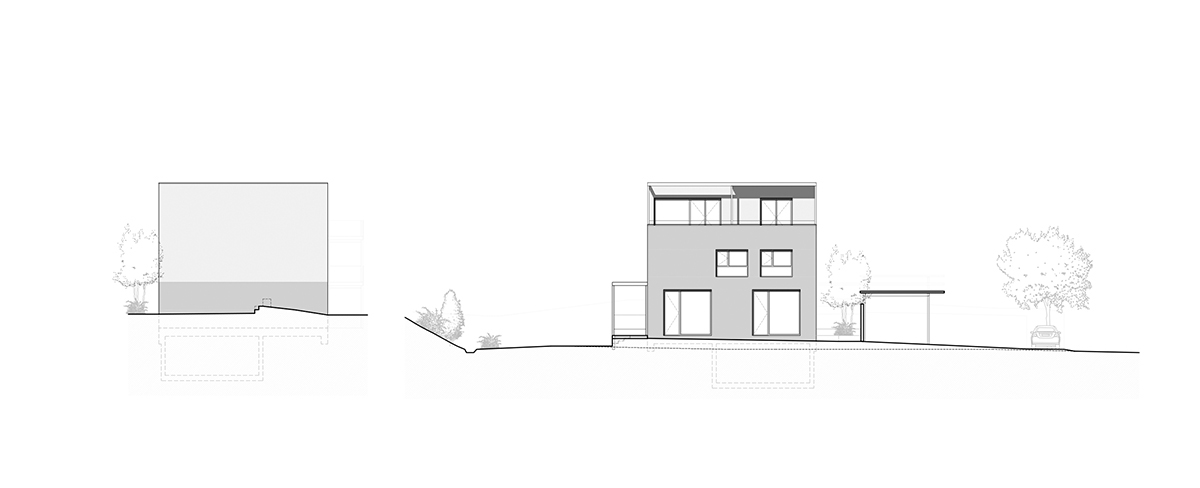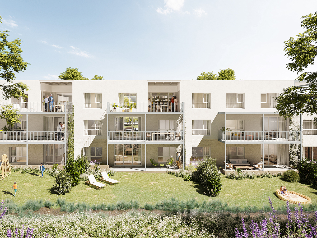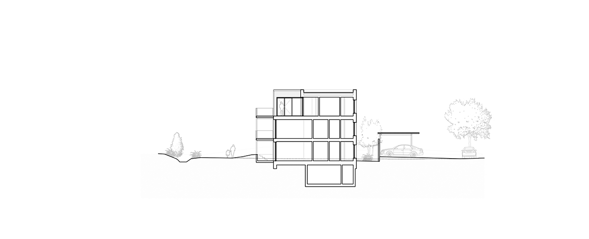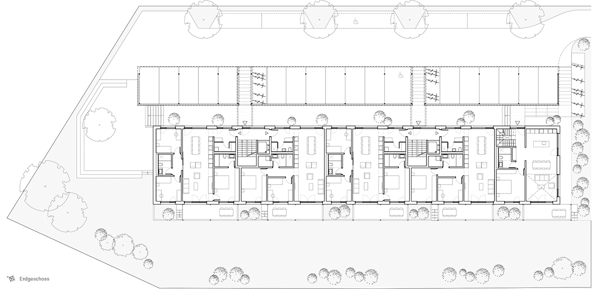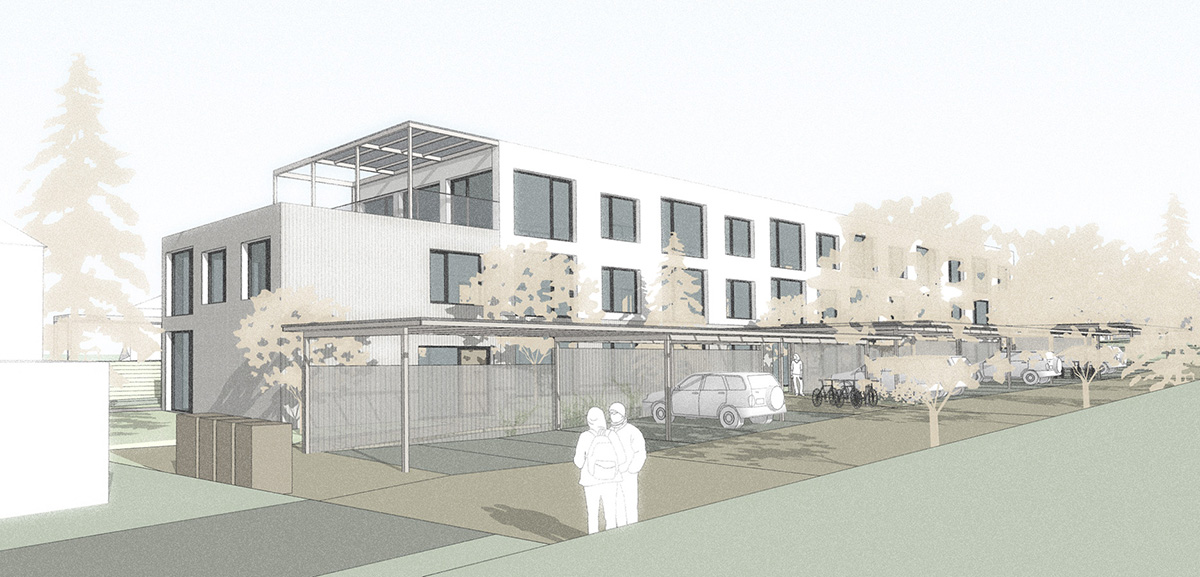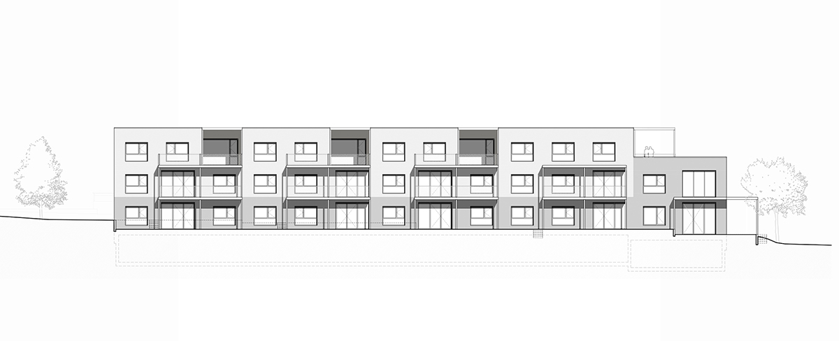 Le coût d’objectif étant restreint, une construction compacte et sans parking souterrain a été privilégiée. Aussi, un immeuble linéal de trois niveaux se développe tout le long de la parcelle. Un abri pour les voitures le longe et en donne le contrepoint, organisant le stationnement, les accès aux cages d’escaliers et créant des courettes privatives aux appartements du RDC.