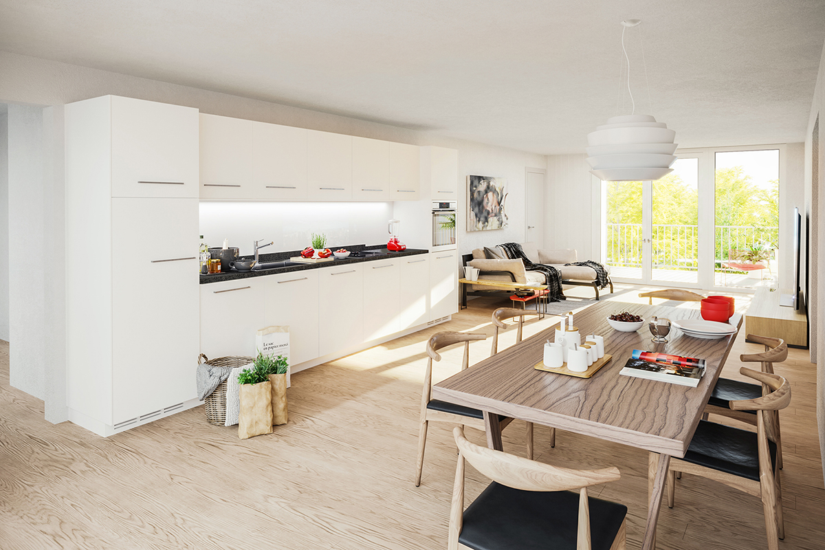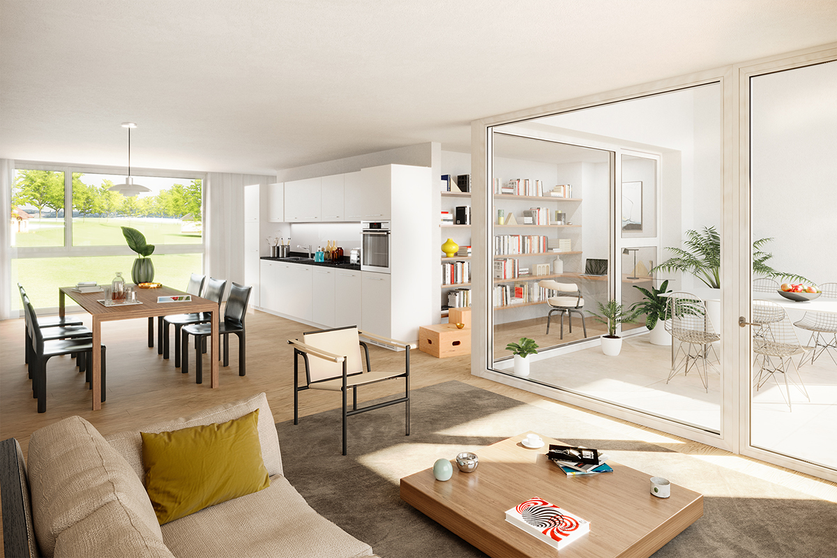 La principale qualité des appartements est leur grand séjour-salle à manger traversant. Ce dispositif permet à chacun de ces espaces de bénéficier au même temps de l’orientation sud-ouest (offrant des généreux balcons) , et des vues dégagées vers les champs agricoles à l’est. Les unités en attique disposent d’un espace terrasse supplémentaire.