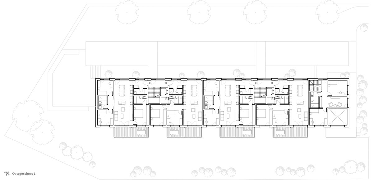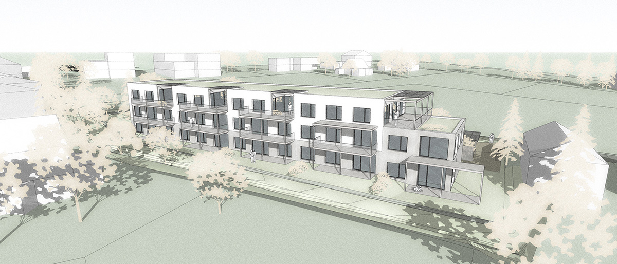Le programme fonctionnel prévoit 13 unités d’habitation dans un mix d’appartements de 2,5 , 3,5 et 4,5 pièces , plus une maison de ville en duplex avec accès individuel.