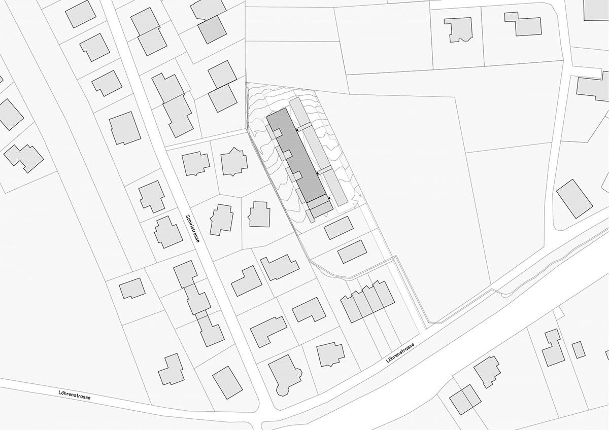 L’immeuble est situé à la périphérie est d’un quartier dominé par des maisons individuelles de deux étages. La parcelle, accessible à travers une servitude, marque à la fois la limite de la commune et la frontière entre le tissu suburbain et des champs agricoles non constructibles.