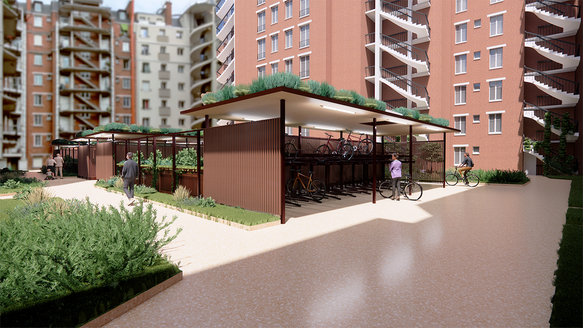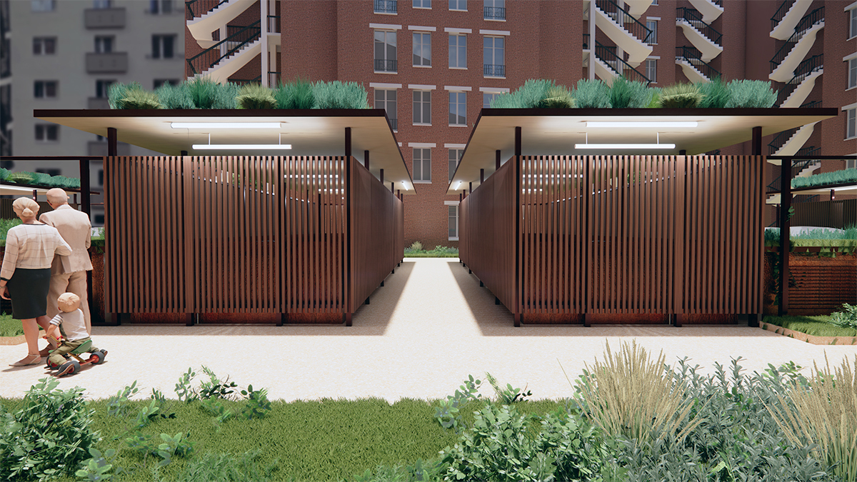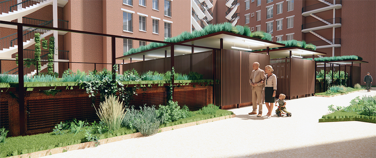 Le projet visant à l’amélioration de la qualité de service pour les locataires une réflexion globale a été portée sur l’organisation des locaux communs (locaux OM, vélos, poussettes) et le fonctionnement de la résidence en lien étroit avec l’agence et les gardiennes. Ces locaux aujourd’hui dispersés de manière anarchique dans la cour ont été regroupés et disposés au centre de la cour afin de limiter les nuisances des logements à rez-de-chaussée et préserver l’intimité résidentielle.