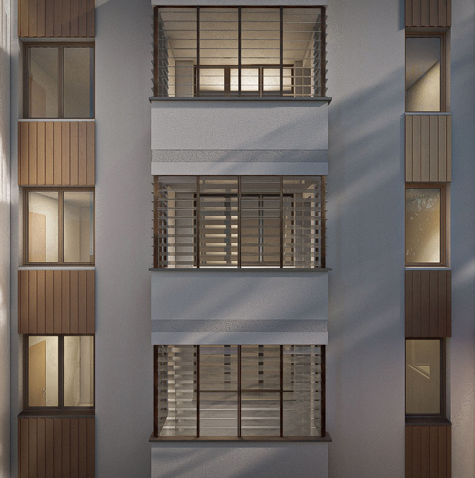 Le projet de réhabilitation vise à améliorer durablement le confort des logements et la qualité des espaces communs. Il prévoit la rénovation des façades, recherchant une image sobre, contemporaine et intemporelle, la réfection complète des toitures-terrasses, le remplacement des menuiseries et l’ajout d’occultations aujourd’hui absentes, l’optimisation de la ventilation et la modernisation des équipements intérieurs. En façade, les allèges des séjours sont prévues déposées afin d’ouvrir les logements plus généreusement sur les loggias remises en état et valorisées.